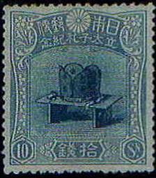 Keywords: Nominnation of Crown Prince Hirohito 10sen stamp.jpg ja 昭和天皇の皇太子時代の立太子記念切手のうち10銭切手 式の際に用いられた冠を描く さくら日 切手カタログ2011年版より転載 大日 国 信 1916-11-03 PD-Japan Stamps of Japan 1916