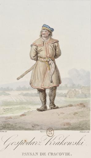 Keywords: Norblin - Peasant from Krakow.jpeg Artwork Creator Jean-Pierre Norblin de La Gourdaine Farmer from Krakow Paysan de Cracovie Gospodarz krakowski К естьянин владеющий землёй зажиточный к естьянин фе ме кулак; букв господин господа ь из К акова 1817 Institution Bibliothèque nationale de France object history credit line Zbior wzorowy rozmaitych polskich ubiorow pędzlem znanego malarza Norblin wydanych a przez slawnego Debucourt na miedzi wyrzniętych accession number ark /12148/btv1b8449724s PD-old-100 Polish costume collection drawn from nature by Norblin and engraved by Debucourt Folk costumes of Lesser Poland National costume of Poland in art Four-pointed caps |