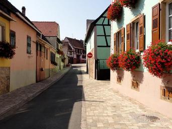 Keywords: nordheim france city town buildings flowers sky clouds urban sidewalk walkway architecture outside summer spring