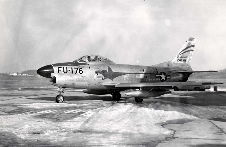 Keywords: naa north american northamerican f-86 f86 sabre jet fighter korea usaf air force airforce aircraft airplane vehicle blackandwhite outdoor black and white North American F-86D (S/N 52-4176) of the 97th Fighter-Interceptor Squadron, Wright-Patterson Air Force Base. (U.S. Air Force photo) North American F-86D (S/N 52-4176) of the 97th Fighter-Interceptor Squadron, Wright-Patterson Air Force Base. (U.S. Air Force photo) |