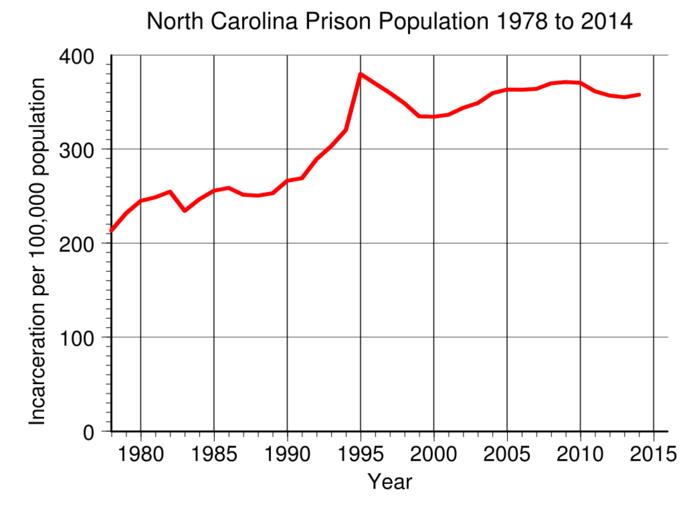 | Keywords: North Carolina Prison Population.svg en North Carolina prison incarceration rate per 100 000 population from 1978 to 2014 Data from http //www bjs gov/index cfm ty nps BJS 2016-05-11 own Delphi234 other versions current annually Generated with Wikimedia SVG Chart SVG Chart/box cc-zero Prisons in North Carolina Imprisonment and detention rates in the United States |