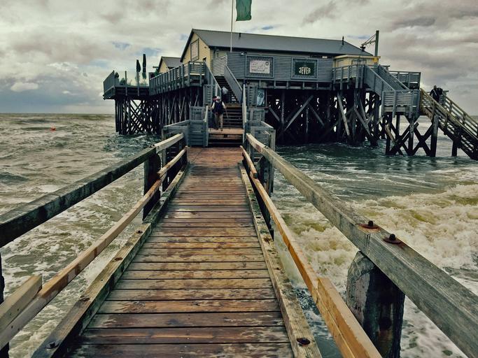 Keywords: north sea riptide saint peter ording germany coast mood wooden bridge sea bridge small stormy water sky
