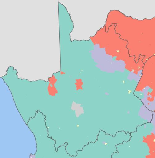 | Keywords: Northern Cape 2001 dominant population group map.svg fb8072 Black African 8dd3c7 Coloured 80b1d3 Indian or Asian ffffb3 White bebada No group dominant d0d0d0 No population Projection is Albers Equal-Area Conic with standard parallels at 25 5° S and 31 5° S and origin at 28 5° S 25 5° E Statistics South Africa's Census 2001 is the source of the basic population data The map results from my own processing of the data Htonl 2010-02-15 Htonl The following license applies to the population data on which the map is based http //www statssa gov za/copyrightdisclaimer asp the user acknowledges Stats SA as the source of the basic data wherever they process apply utilise publish or distribute the data and also that they specify that the relevant application and analysis where applicable result from their own processing of the data The following tag applies to the map itself Demographic maps of South Africa Maps of the Northern Cape |