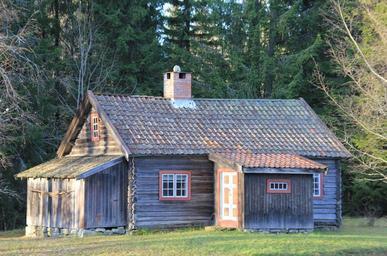 Keywords: norway log cabin forest trees woods nature outside house home grass plants summer spring country countryside rural rustic