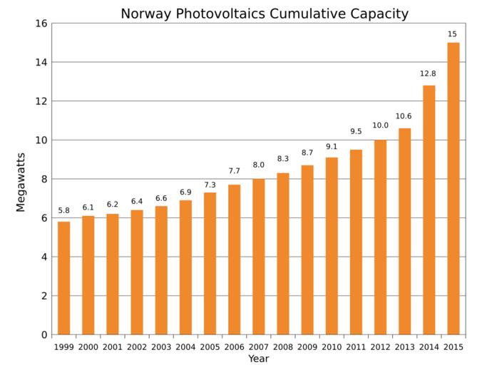 Keywords: Norway Photovoltaics Installed Capacity.svg translate yes en Installed photovoltaics in Norway from 1999 to 2015 Source http //www iea-pvps org/index php id 92 eID dam_frontend_push docID 2795 IEA-PVPShttp //www iea-pvps org/fileadmin/dam/public/report/PICS/IEA-PVPS_-__A_Snapshot_of_Global_PV_-_1992-2015_-_Final_2_02 pdf 2016-03-11 own Delphi234 other versions cc-zero Solar energy in Norway Photovoltaic power statistics |