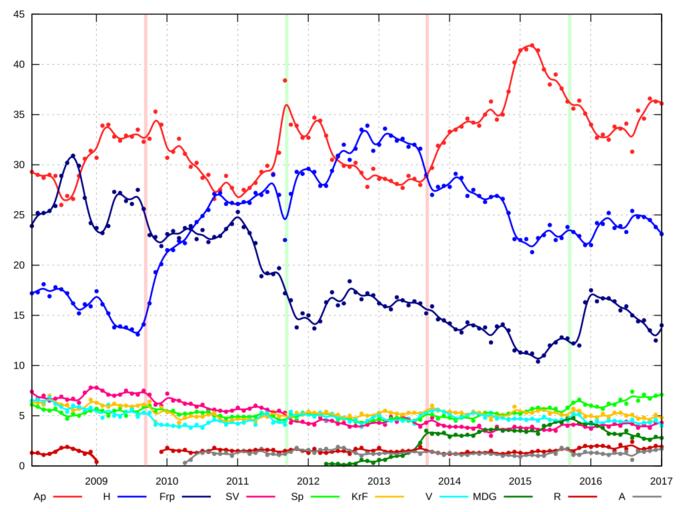 | Keywords: Norwegian Storting Monthly Party Polls.svg en What fraction of the population would vote for each party in a Norwegian Storting election based on monthly poll data from pollofpolls no starting from 2008 The vertical light red lines mark Storting elections while the light green ones mark local elections The x axis is the year and the y axis is the popularity in percent 2016-12-29 own Amaurea other versions Statistical charts Politics of Norway Stortinget Cc-zero | ||||