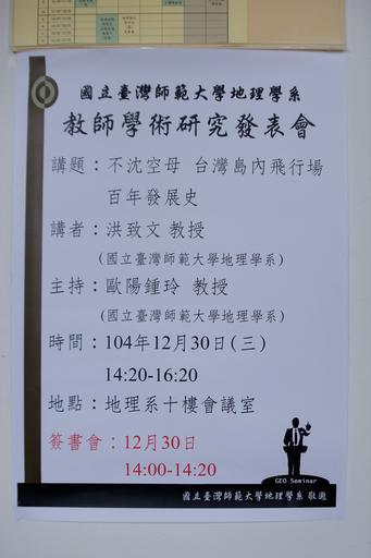 | Keywords: Notice of Chin-Wen Hung's Speech 20151230.jpg zh-tw 臺灣師範大學臺北校 勤大樓10樓 理系 議室入口旁, 日洪致文演講的告示 2015-12-30 13 47 08 Own 玄史生 other versions Chin-Wen Hung's Speech about the History of Airfields and Airports in Taiwan 玄史生写 文庫 Taken with Fujifilm X-T1 Uploaded with UploadWizard cc-zero |
