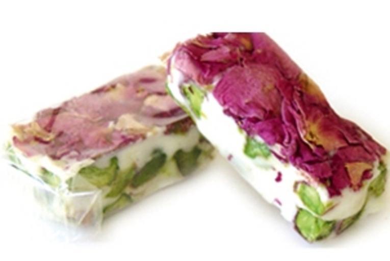 Keywords: Nougat-damascene.jpg Nougat Damascene Petales de Rosess Pistache d'Alep www confiserie-de-luxe com 2006-12-24 Waeil Alostoiny Nougat Pistachio nuts as food Roses as food Purple Rosa × damascena Bars dessert Green pink white Cuisine des fleurs |