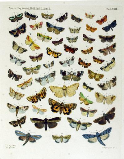 | Keywords: NovaraExpZoologischeTheilLepidopteraAtlasTaf108.jpg de Reise der Österreichischen Fregatte Novara um die Erde in den Jahren 1857 1858 1859 unter den Befehlen des Commodore B von Wüllerstorf-Urbair 1864 <br>Zoologischer Theil 2 Band Zweite Abteilung Lepidoptera Atlas Tafel CVIII <br>1 Ariola ransonneti; 2 Tortricomorpha albofascia; 3 Tortricomorpha atrosignata; 4 Tortricomorpha flaviceps; 5 Tortricomorpha costipuncta; 6 Erastria africana; 7 Acantholipes trimeni; 8 Thalpochares accedens; 9 Thalpochares sperans; 10 Thalpochares griseola; 11 Thalpochares adulans; 12 Thalpochares pennula; 13 Thalpochares delicata; 14 Thalpochares squamilinea; 15 Thalpochares accincta; 16 Thalpochares sabia; 17 Thalpochares sacraria; 18 Thalpochares novarae; 19 Thalpochares ornatula; 20 Earias plaga; 21 Eastria bogotana; 22 Cirrhoedia accola; 23 Acontia inda; 24 Acontia acclivis; 25 Acontia acerba; 26 Acontia guttifera; 27 Acontia scanda; 28 Acontia madanda; 29 Acontia bilimeki; 30 Acontia redita; 31 Acontia admota; 32 Acontia unio; 33 Acontia komaga; 34 Acontia umbrigera; 35 Acontia urbani; 36 Metoptria absita; 37 Erastria bavia; 38 Anarta ladakensis; 39 Xanthodes adunca; 40 Heliothis delicia; 41 Heliothis conchula; 42 Heliothis acesias; 43 Agrotis hyblaea; 44 Calesia cirrus; 45 Thalpochares aerugo; 46 Epimecia abunda; 47 Epimecia aenigma; 48 Euphasia cliens; 49 Heliocheilus translucens; 50 Magusa dissidens; 51 Magusa sarpida; 52 Cucullia consimilis; 53 Cucullia terensis; 54 Cucullia pallidistria; 55 Aspila tergemina 2008-11-06 http //caliban mpiz-koeln mpg de/felder/novara_tafeln/icon_page_00132 html author File Acantholipes trimeni Novara exp jpg PD-old Uploaded with UploadWizard Reise Fregatte Novara Volume 2 Section 2 -plate108 CVIII |