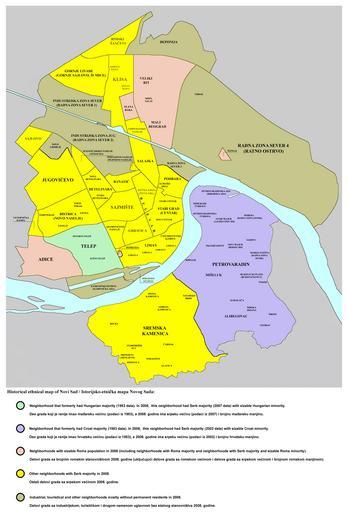 Keywords: Novi sad quarters ethnic.png English Historical ethnical map of Novi Sad 1953-2008 Serbian Istorijsko-etnička mapa Novog Sada 1953-2008 2008-11-15 own assumed PANONIAN my own work References Ferenc Uri Telep Enciklopedija Novog Sada knjiga 28 Novi Sad 2007 Mr Vladimir Stojanović - Dr Dušan Popov Petrovaradin Enciklopedija Novog Sada knjiga 20 Novi Sad 2002 30 godina mesne zajednice 7 Juli u Novom Sadu 1974-2004 Monografija Novi Sad 2004 Popis stanovništva domaćinstava i stanova u 2002 Stanovništvo - nacionalna ili etnička pripadnost - Podaci po naseljima knjiga 1 Republika Srbija - Republički zavod za statistiku Beograd februar 2003 Branko Ćurčin Slana Bara - nekad i sad Novi Sad 2002 Branko Ćurčin Novosadsko naselje Šangaj - nekad i sad Novi Sad 2004 Maps of Novi Sad Novi sad quarterss02 Maps of the history of Novi Sad Demographic maps of Vojvodina Maps of the Serbs in Serbia Maps of the Hungarians Maps of the Croats Maps of the Roma people Maps in Serbian Novi sad quarterss02 |