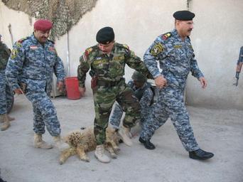 Keywords: NP, CF leaders meet to welcome new brigade commander DVIDS65192.jpg en Col A'amer Khamees Hameed commander of the 1st Brigade 1st National Police Division Maj Gen Riyadh commander of the 9th Iraqi Army Division and Gen Kareem commander of the 1st NP Div step over a freshly killed sheep together before a meeting between leaders of the 1/1 NP brigade and the 3rd Heavy Brigade Combat Team 3rd Infantry Division Nov 13 at the 1st NP brigade headquarters in Salman Pak Iraq Stepping over the sheep symbolizes good luck 2007-11-14 https //www dvidshub net/image/65192 65192 2007-11-14 12 57 SALMAN PARK IQ PD-USGov 3rd Infantry Division United States Images from DoD uploaded by Fæ