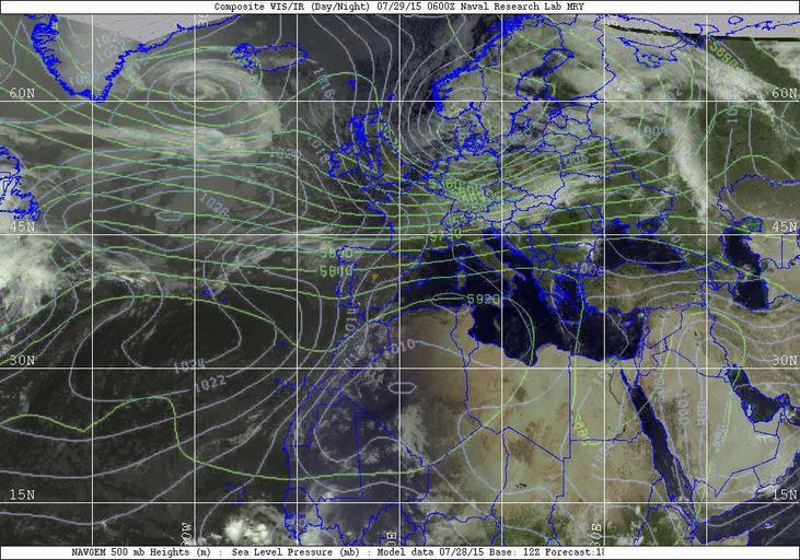 | Keywords: NRL MRY 500hpa+SLP 20150729.jpg NAVGEM 500 mb hPa Heigths and Sea Pressure Level mb on Composite Vis/IR Day/Night for Wen 29 JUL 2015 00 UTC Image illustrates Azores high shifted north and a Denmark low Cold stiff westerly winds north of the Alps Paris 20°C Moscow 23°C warm westerly wind belt south with extreme high temperatures extending to near east during 2015 European Central Asia heat wave Madrid 38°C Algier 40°C Athens 39°C Cairo 38°C Baghdad 49°C http //www wetterzentrale de/pics/m7slp html m7slp and http //www wetterzentrale de/pics/m7500hpa html m7500hpa via http //www wetterzentrale de/ wetterzentrale de Satellitenbilder Mit Isobaren / Mit 500 hPa 2015-07-29 US Naval Research Laboratory Marine Meteorology Division Monterey NRL MRY <br/>File W B <span class signature-talk ></span> PD-USGov-Military-Navy I recoloured m7slp with GIMP to yellow and recombined them 2015 european heat wave Weather maps of Europe 2015 maps of Europe Geopotential height maps Atmospheric pressure maps Maps of heat events Maps of weather in 2015 07290000 2015-07-29 |