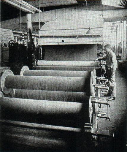 | Keywords: NSRW Story of Wool - slashing machine.jpg en SLASHING MACHINE This is a machine for sizing the threads In a slasher the threads from a number of warping beams are first combined into one sheet and then plunged into a trough filled with size which is kept at a boiling temperature and next squeezed between two pairs of rollers The sheet of yarn almost encircles two steam-heated cylinders This quickly dries the yarn The yarn is next measured passed above and below rods which separate the threads which are wound upon a loom beam The New Student's Reference Work v 5 1914 Story of Wool narrative between pp 2108 and 2109 third page Underwood Underwood published 1914 PD-US LA2-NSRW-5-0123 jpg Underwood Underwood Woollen mills |