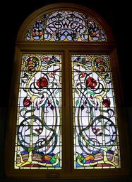 | Keywords: NSWGR composite.JPG Australia Sydney New South Government Railways Central Station the old Booking Office one of several large windows of the same design Art Nouveau in style dating from about 1900 utilising Tiffany's Favrile glass the streaked and opalescent coloured glass and so-called Cathedral glass the mottle white and yellow glass The large red flowers are Waratahs the state emblem of NSW The photo is a composite because the large awning outside and the encroachment of portable offices makes it hard to take a snapshot photo TTaylor photo 2006 unknown perhaps Radecki for Ashwin and Co Old PD-old Stained glass windows in Australia Central railway station Sydney Telopea speciosissima Art Nouveau stained glass windows in Australia Favrile glass Stained glass windows of train stations |