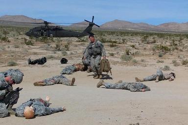 | Keywords: weed army community hospital weedarmycommunityhospital wach national training center nationaltrainingcenter ntc fort irwin fortirwin california col. jason wieman coljasonwieman command sgt maj. albert harris commandsgtmajalbertharris 2916th aviation battalion 2916thaviationbattalion emergency medical care emergencymedicalcare meddac rhc-c rhcc patient care patientcare soldier readiness soldierreadiness army training armytraining medical evacuation medicalevacuation medevac capt. sean donohue captseandonohue outdoor FORT IRWIN, Calif. -- The 2916th Aviation Battalion utilized an off-cycle window in their calendar March 20 - 23 to conduct brigade-level training in the National Training Center's "Box". The exercise culminated at the Fort Irwin Weed Army Community Hospital (WACH) March 23. The goal of the training is to test readiness as well as hone emergency medical skills among the participating service members. One simulation presented the participants with an Improvised Explosive Device (IED) attack on a troop transport that resulted in 16 casualties. The role players required triage at the point of injury in the training area, then airlifted back to the WACH on Fort Irwin for treatment. This was a large-scale training module that involved complex planning. To make the exercise as authentic as possible training units had no warning of what they would encounter throughout the course of the event and participants were alerted only as the scenario unfolded, just as if the casualties and events were real. Large casualty events of this kind take a special type of planning coordination, material and geography to execute, and even more consideration to undertake, which makes the NTC an ideal venue for such training. The 2916th assumed the role of air medevac, requiring multiple airlifts to bring all casualties back to the WACH, where staff members prioritized, stabilized and treated the mock casualties, then prepared to fly any they determined needing specialized care beyond WACH capabilities to other nearby available medical facilities for more extensive treatment. To learn more about the people and facilities of the National Training Center and the Weed Army Community Hospital visit their official websites at www.irwin.army.mil or www.irwin.amedd.army.mil Photo by Captain Sean Donoghue for WACH Public Affairs (Released), FORT IRWIN, Calif. -- The 2916th Aviation Battalion utilized an off-cycle window in their calendar March 20 - 23 to conduct brigade-level training in the National Training Center's "Box". The exercise culminated at the Fort Irwin Weed Army Community Hospital (WACH) March 23. The goal of the training is to test readiness as well as hone emergency medical skills among the participating service members. One simulation presented the participants with an Improvised Explosive Device (IED) attack on a troop transport that resulted in 16 casualties. The role players required triage at the point of injury in the training area, then airlifted back to the WACH on Fort Irwin for treatment. This was a large-scale training module that involved complex planning. To make the exercise as authentic as possible training units had no warning of what they would encounter throughout the course of the event and participants were alerted only as the scenario unfolded, just as if the casualties and events were real. Large casualty events of this kind take a special type of planning coordination, material and geography to execute, and even more consideration to undertake, which makes the NTC an ideal venue for such training. The 2916th assumed the role of air medevac, requiring multiple airlifts to bring all casualties back to the WACH, where staff members prioritized, stabilized and treated the mock casualties, then prepared to fly any they determined needing specialized care beyond WACH capabilities to other nearby available medical facilities for more extensive treatment. To learn more about the people and facilities of the National Training Center and the Weed Army Community Hospital visit their official websites at www.irwin.army.mil or www.irwin.amedd.army.mil Photo by Captain Sean Donoghue for WACH Public Affairs (Released), |