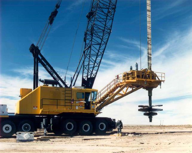 Keywords: NTS - Big Hole Drilling 003.jpg en This equipment at the U S Department of Energy ™s Nevada Test Site is capable of augering soil down to a depth of 150 feet Here it is suspended from a 150 ton crane The rotary auger is driven by two separate motors suspended from the raised platform It is used to start some vertical bore holes from underground nuclear tests 1286 NF-4559 Federal Government of the United States PD-USGov Crane trucks Drilling machines Unidentified trucks Nevada Test Site Big Hole Drilling Semi-trailer trucks |