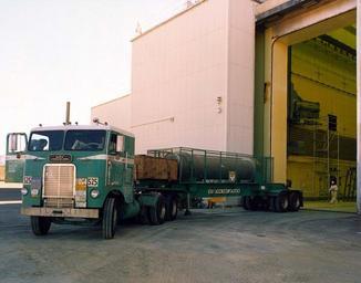 Keywords: NTS - EMAD Facility 005.jpg en Nevada Test Site - Nuclear Rocket Development Station A truck at the E-MAD building in Area 25 of the Nevada Test Site trucks brought the spent fuel rods from the Turkey Point reactor in Florida The fuel rods were remotely encapsulated in stainless steel canisters remotely welded shut and stored for transport in the Climax facility for underground radioactive waste storage investigations in granite 1018 WA-368 Federal Government of the United States 36 806459 -116 304649 PD-USGov NRDS E-MAD White-Freightliner WFT / Freightliner FLT Transport of nuclear waste containers Green trucks |