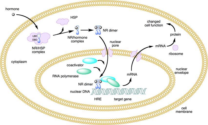| Keywords: Nuclear receptor action.png Created myself using CambridgeSoft BioDraw Boghog2 10 14 9 June 2007 UTC Mechanism nuclear receptor action This figure depicts the mechanism of a class I nuclear receptor NR which in the absence of ligand is located in the cytosol Hormone binding triggers dissociation of heat shock proteins HSP dimerization and translocation to the nucleus where it binds to a specific sequence of DNA known as a hormone response element HRE The nuclear receptor DNA complex in turn recruits other proteins that are responsible for translation of downstream DNA into RNA and eventually protein which results in a change in cell function Made by Boghog2 2007-06 Boghog2 Acción de receptores nucleares I png en En Wikipedia Boghog2 Genetic diagrams Systems biology Signal transduction |