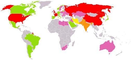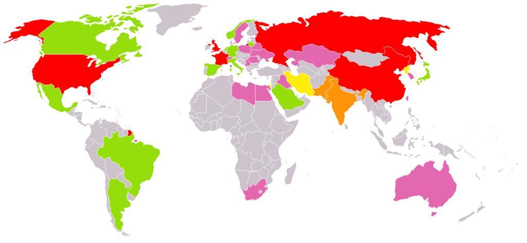 | Keywords: Nuclear weapon programs worldwide 2.png  Image of worldwide nuclear weapons programs as of September 2005 Based on info at en List of countries with nuclear weapons filled into Image BlankMap-World png originally by User Fastfission but now by others as well see below Rendered without labels for multi-lingual support Feel free to update this very easy using Photoshop or GIMP as reliable information changes <font color ED2024 >Rojo</font> Five nuclear weapons states from the NPT <font color FF940A >Anaranjado</font> Other known nuclear powers <font color ffff00 >Amarillo</font> States suspected of having possession of or suspected of being in the process of developing nuclear weapons and/or nuclear programs <font color E368B0 >Morado</font> States which at one point had nuclear weapons and/or nuclear weapons research programs <font color 7cfc00 >Verde</font> Other states capable of developing nuclear weapons Historical states have been represented by their successor states i e Yugoslavia by Serbia and Montenegro as they apparently inherited the nuclear materials of the socialist state after it fragmented 2006-08-05 own assumed Robotico Distributional maps of the world Nuclear proliferation Maps needing South Sudan political boundaries |