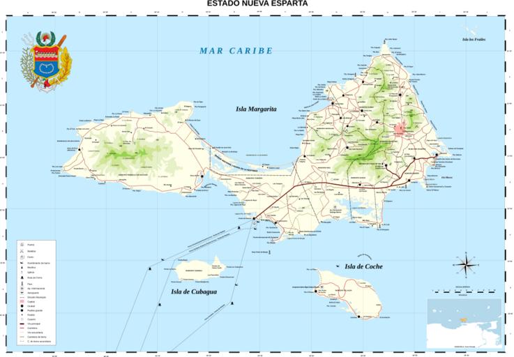 | Keywords: Nueva Esparta Mapa Vial.svg stato Nueba Esparta Estat de Nueva Esparta Nueva Esparta Karte von Nueva Esparta Nueva Esparta New Sparta is one of the 23 states estados of Venezuela It comprises Margarita Island by far the largest and most important island Coche and uninhabited Cubagua The state is the smallest one in area and is located off the northeast Caribbean coast of Venezuela It is the only insular state of Venuezuela Its name comes from the heroísm shown by its inhabitants during the Venezuelan War of Independence deemed similar to that of the Spartan soldiers of Ancient Greece The main island of Margarita alone has an area of 934 km² In 1909 the state was constituted and in 1947 the island of Cubagua was added Its capital city is La Asunción but the main urban center is Porlamar Nueva Esparta es un estado federal de Venezuela ubicado al noreste del país siendo el único Estado Federal insular y el de menor superficie de la nación El estado posee gran cantidad de monumentos históricos en la iglesia de Santa Ana fue declarada la Tercera República de Venezuela y Simón Bolívar su presidente El Estado fue designado con ese nombre a partir del 12 de mayo de 1817 con el propósito de hacer un homenaje al heroísmo de los habitantes de la isla de Margarita durante la guerra de Independencia de Venezuela calificado como Heroísmo espartano porque hizo recordar la valentía de los ciudadanos de la capital de la porción de Laconia Esparta en la península del Peloponeso en la antigua Grecia Aquí nacieron Luis Beltrán Prieto Figueroa Santiago Mariño y otros grandes personajes de la historia regional y nacional L État de Nueva Esparta « Nouvelle Sparte » est un des 23 États estados du Venezuela Il comprend les îles de Margarita de loin la plus grande et plus importante avec une surface de 934km² à elle seule Coche et Cubagua inhabitée C est le seul État insulaire du Venezuela et le plus petit de la région il est localisé sur la côte antillaise au nord-est du Venezuela Son nom vient de l héroïsme montré par ses habitants durant la guerre d indépendance vénézuelienne jugé semblable à celui des soldats spartiates de la Grèce antique L État a été constitué en 1909 et l île de Cubagua a été ajoutée en 1947 Sa ville capitale est Asunción mais le principal centre urbain est Porlamar Nueva Esparta Nueva Esparta ベネズエラ ヌエバ・エスパルタ州の 図 Nueva Esparta Nueva Esparta Nueva Esparta Nueva Esparta Nueva Esparta Estado de Nueva Esparta уэва-Эспа та Nueva Esparta Nya Sparta en delstat i Venezuela Иёлоти уэва Эспа та 新埃斯帕塔州 Own data obtained traveling across the zone with a GPS Coat of arms File Escudo Nueva Esparta svg 2007 User The Photographer/info cc-zero Map of Nueva Esparta svg Venezuela Nueva Esparta location map svg <gallery> File Division Politico Territorial Nueva Esparta svg File Nueva_Esparta_Mapa_Interactivo jpg </gallery> picture of the day 2009 12 14 Assessments 5 2008 1 1 Translation possible Created with Inkscape Maps of Isla Margarita Maps of Nueva Esparta Maps of islands of Venezuela SVG maps in Spanish Featured pictures of Isla Margarita Featured pictures on Wikimedia Commons - vector Featured pictures by User The Photographer Unassessed QI candidates Drawings by The Photographer Files by The Photographer Images of Venezuela by User The Photographer |