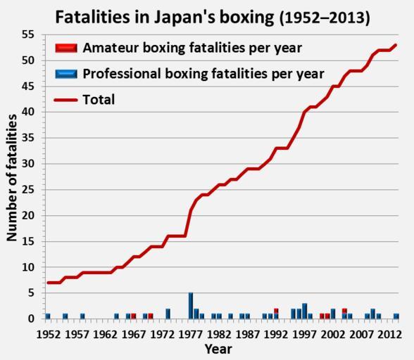 | Keywords: Number of fatalities in Japan's boxing.png The number of fatalities in Japan's boxing 1952 2012 The numbers include six deaths before 1952 Boxers who died after being in a coma for several years after the fatal fight are included in the year the fight happened Created from text data Cite book Boxing Magazine editorial department with Japan Boxing Commission Japan Pro Boxing Associations 日 クシング年鑑2005 Japan Boxing Year Book 2005 April 30 2005 Baseball Magazine Sha Co Ltd Tokyo Japan Japanese 978-4-583-03849-0 188 クシング百科全書 リング禍 Cite web http //ejmas com/jcs/velazquez/Muerte2011_pdf_Sep_2011 pdf Death under the Spotlight The Manuel Velazquez Boxing Fatality Collection The Data pdf Joseph R Svinth 2011 Journal of Combative Sport March 8 2013 2013-03-08 own Charts Boxing in Japan |