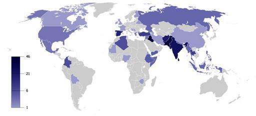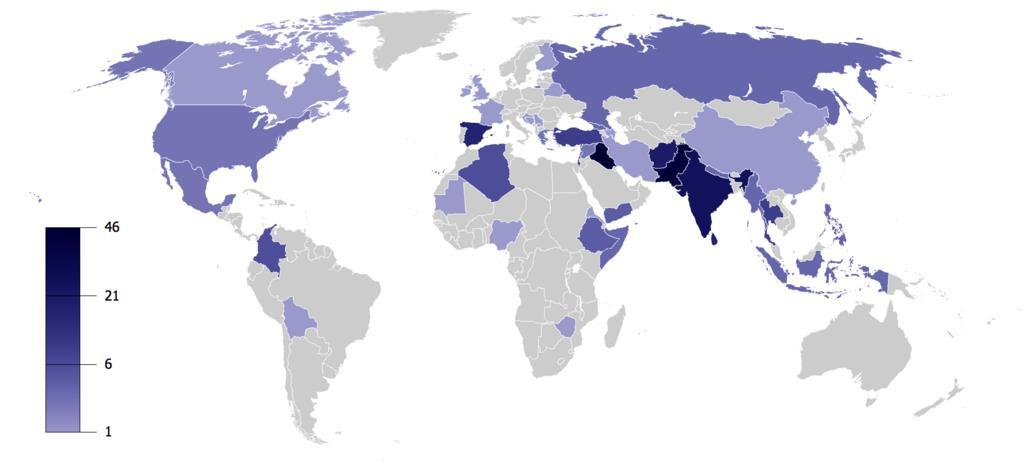 Keywords: Number of terrorist incidents 2008.png Terrorist Incidents 2008 svg en Number of terrorist incidents for 2008 according an article on the English Wikipedia Based on the Wikipedia List of terrorist incidents 2008 Emilfaro en 2009-02-08 GunnMap <gallery> File Terrorist Incidents 2008 svg SVG version File Number of Terrorist Incidents png 2000-2008 </gallery> The data wikitable Iraq 46 - Pakistan 42 - Spain 33 - India 55 - Afghanistan 20 - Sri Lanka 17 - Israel 12 - Thailand 9 - Turkey 9 - Algeria 6 - Colombia 6 - Ethiopia 4 - Lebanon 4 - Yemen 4 - Burma 3 - Georgia 3 - Indonesia 3 - Nepal 3 - Philippines 3 - Russia 3 - Somalia 3 - Greece 2 - Mexico 2 - Syria 2 - US 2 - Azerbaijan 1 - Belarus 1 - Bolivia 1 - Bosnia and Herzegovina 1 - Canada 1 - China 1 - Croatia 1 - Eritrea 1 - Finland 1 - France 1 - Iran 1 - Ireland 1 - Mauritania 1 - Nigeria 1 - Serbia 1 - UK 1 - Zimbabwe 1 Terrorist incidents 2008 maps |