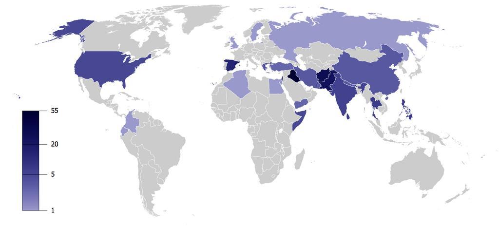 Keywords: Number of terrorist incidents 2009.png en Number of terrorist incidents for 2009 January - June Based on the Wikipedia http //en wikipedia org/w/index php title List_of_terrorist_incidents _2009 oldid 299922959 List of terrorist incidents 2009 Emilfaro en 2009-04-06 GunnMap <gallery> File Number of terrorist incidents 2008 png 2008 File Number of Terrorist Incidents png 2000-2008 </gallery> The data January - June 2009 wikitable Iraq 55 - Afghanistan 30 - Pakistan 25 - Spain 14 - Israel 8 - Philippines 7 - Sri Lanka 7 - Thailand 7 - India 6 - Somalia 5 - United States 5 - Greece 4 - China 3 - Iran 3 - Nepal 3 - Turkey 2 - Yemen 2 - Algeria 1 - Colombia 1 - Ecuador 1 - Egypt 1 - Russia 1 - Sweden 1 - United Kingdom 1 - Total 193 Terrorist incidents 2009 maps |