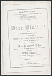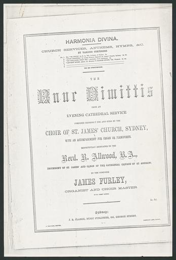 | Keywords: Nunc dimittis.jpg en Cover page of Nunc dimittis music by James Furley organist and choir master of St James' Church Sydney 1860 http //nla gov au/nla mus-vn5715925 James Furley Composed expressly for and sung by the choir of St James' Church Sydney with an accompaniment for organ or pianoforte by the composer James Furley organist and choir master of St James' Church music Furley James 1831-1912 From an evening cathedral service Custom license marker 2014 01 14 PD-Aus PD-old Uploaded with UploadWizard St James' Church Sydney Sheet music Choirs History of Sydney Nunc dimittis |
