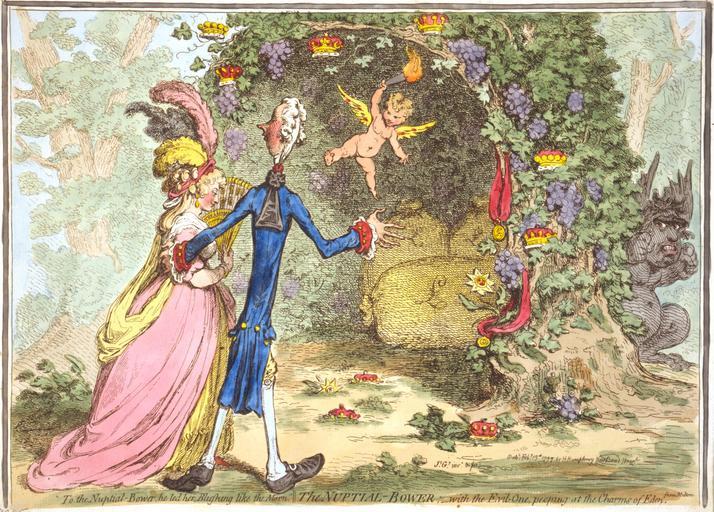 Keywords: Nuptial-Bower-Gillray.jpeg The Nuptial-Bower; ”with the Evil-One peeping at the Charms of Eden from Milton Js Gy inv fect SUMMARY Cartoon shows William Pitt escorting Eleanor Eden to a vine-shaded bower within which are three large sacks with the British pound symbol on them possibly representing Pitt's debt Bunches of grapes crowns and medallions suspended from ribbons hang from the bower A devil-like creature the Evil-One representing Charles James Fox peers around the bower from the right MEDIUM 1 print etching hand-colored CREATED/PUBLISHED London Pubd by H Humphrey 1797 Feby 13th Also see Wright Evans Historical and Descriptive Account of the Caricatures of James Gillray 1851 OCLC 59510372 pp 95 “8 Library of Congress Prints Photographs Division LC-USZC4-8793 color film copy transparency http //memory loc gov/master/pnp/cph/3g00000/3g08000/3g08700/3g08793u tif uncompressed archival TIFF version 49 MB level color pick white point adjust black level cropped and converted to JPEG quality level 88 with the GIMP 2 4 5 1797-02-13 creator James Gillray No known restriction on publication File The nuptial-bower; - with the evil-one peeping at the charms of Eden' Eleanor Eden; William Pitt; Charles James Fox by James Gillray jpg LOC-image cph 3g08793 PD-old-100 James Gillray Caricatures of William Pitt the Younger Charles James Fox Crowns in art Wine and vineyard engraving |