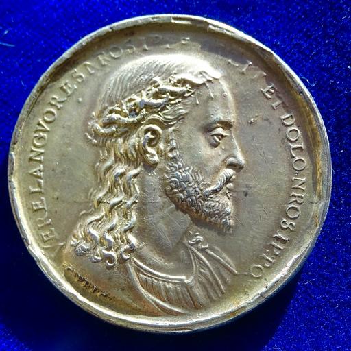 Keywords: Nuremberg Silver Medal Jesus by Valentin Maler ND, obverse.jpg en Old cast gilt wedding medallion d 46 mm 30 76 g Ag Portrait r of Jesus Christ with crown of thorns curved above VERE LANGVORES NROS IPSE TVLIT ET DOLO NROS IP PO / An angel marrying a couple clothed in 16th century style curved above EIN VERNVNFFTIG WEIB KOMPT VOM HERRN 2 lines on plate below FATO CONV BIA FIVNT· In exergue PROXIX TOBXII CVM IRIVILEGIE VM Cahn Kunstmedaillen und Plaketten des XV bis XVII Jahrhunderts Frankfurt 1912 No 91 Habich 209 8 Medallist VM Valentin Maler Mint-master in Nürnberg about 1540 - 1603 Condition EXCELLENT old cast 1603-12-31 15 45 10 own Berlin-George other versions cc-by-sa-4 0 PD-old-100 PD-1923 Numismatics Christian medals 1603 Medals of Germany Jesus Christ Things named after Nuremberg 1603 medals Silver medals Valentin Maler |