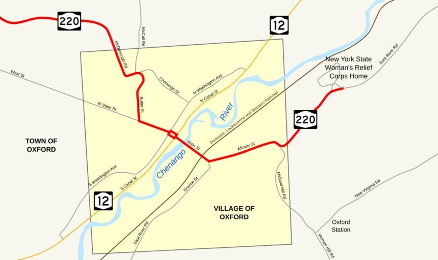 | Keywords: NY 220 original routing in Oxford.svg New York State Route 220 in Oxford New York Features traced in Inkscape from a http //www nysgis state ny us/gisdata/quads/drg24/usgspreview/index cfm code o42075d5 1949 USGS topographic map of Oxford The routing of NY 220 east of the Chenango River was not marked on the topographic map but is clearly marked on a 1940 Rand McNally map of New York and implicitly marked on prior maps as well Own TwinsMetsFan 2009-05-23 New York State Route 220 Road maps of New York |