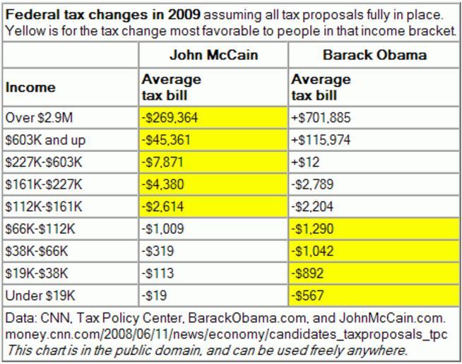 Keywords: Obama McCain taxes.gif Federal tax changes in 2009 assuming all tax proposals fully in place Yellow is for the tax change most favorable to people in that income bracket Data CNN Tax Policy Center BarackObama com and JohnMcCain com http //money cnn com/2008/06/11/news/economy/candidates_taxproposals_tpc/index htm What they'll do to your tax bill By Jeanne Sahadi June 11 2008 CNNMoney com Article and chart http //money cnn com/galleries/2008/news/0806/gallery election_issues/11 html Your Money McCain vs Obama Personal Taxes CNNMoney com http //www taxpolicycenter org/taxtopics/presidential_candidates cfm TPC Tax Topics 2008 Election Analysis of the 2008 Presidential Candidates' Tax Plans The Tax Policy Center http //origin barackobama com/taxes Barack Obama and Joe Biden The Change We Need Taxes BarackObama com official Barack Obama campaign site http //www johnmccain com/Informing/News/PressReleases/1ad1df45-57a9-4bd4-b71f-9d5c011d14c5 htm McCain-Palin 2008 New Initiatives In The McCain Economic Plan JohnMcCain com official John McCain campaign site wikipedia Political positions of Barack Obama Taxation wikipedia Political positions of John McCain Budget taxes and deficits wikipedia Comparison of United States presidential candidates 2008 Economic issues own Timeshifter I created this image on September 12 2008 See licensing section below Narrow editable table it also can be used freely anywhere wikitable border 1 - 3 Federal tax change in 2009<br> if their tax plans fully in place <br> Yellow is for the largest tax cut - McCain Obama - Income<br> Average Average<br> tax bill Average<br> tax bill - Over 2 9M yellow - 269 364 + 701 885 - 603K and up yellow - 45 361 + 115 974 - 227K- 603K yellow - 7 871 + 12 - 161K- 227K yellow - 4 380 - 2 789 - 112K- 161K yellow - 2 614 - 2 204 - 66K- 112K - 1 009 yellow - 1 290 - 38K- 66K - 319 yellow - 1 042 - 19K- 38K - 113 yellow - 892 - Under 19K - 19 yellow - 567 - 3 CNN <ref name cnn2008june11> http //money cnn com/2008/06/11/news/economy/candidates_taxproposals_tpc/index htm What they'll do to your tax bill By Jeanne Sahadi June 11 2008 CNNMoney com Article and chart </ref><ref> http //money cnn com/galleries/2008/news/0806/gallery election_issues/11 html Your Money McCain vs Obama Personal Taxes CNNMoney com </ref> Tax Policy Center <ref name taxpolicycenter> http //www taxpolicycenter org/taxtopics/presidential_candidates cfm TPC Tax Topics 2008 Election Analysis of the 2008 Presidential Candidates' Tax Plans The Tax Policy Center </ref><br> BarackObama com <ref name obamataxes> http //origin barackobama com/taxes Barack Obama and Joe Biden The Change We Need Taxes BarackObama com official Barack Obama campaign site </ref> JohnMcCain com<ref name mccainplan> http //www johnmccain com/Informing/News/PressReleases/1ad1df45-57a9-4bd4-b71f-9d5c011d14c5 htm McCain-Palin 2008 New Initiatives In The McCain Economic Plan JohnMcCain com official John McCain campaign site </ref> reflist John McCain in 2008 Barack Obama presidential campaign 2008 Tax plans of 2008 U S presidential election candidates United States presidential election 2008 Personal income taxes in the United States |