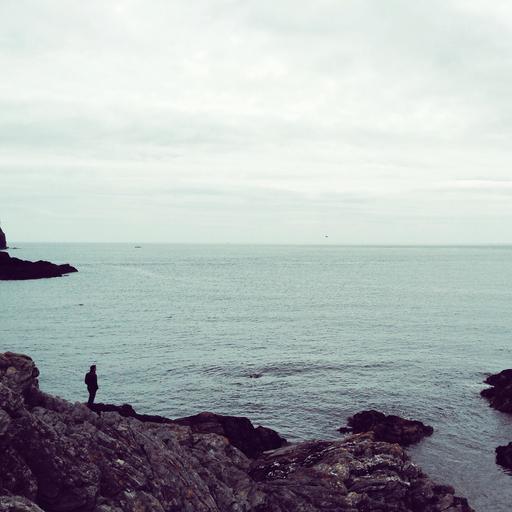 Keywords: ocean view coast shore rocky stones water sea nature grey lonely person looking endless horizon seascape calm tranquil