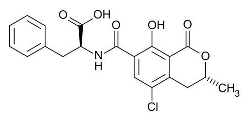 Keywords: Ochratoxin A.svg Chemical structure of Ochratoxin A a mycotoxin from Aspergillus and Penicillinum species own 2007-02-28 created by Minutemen using BKchem 0 12 PD-ineligible Ochratoxins