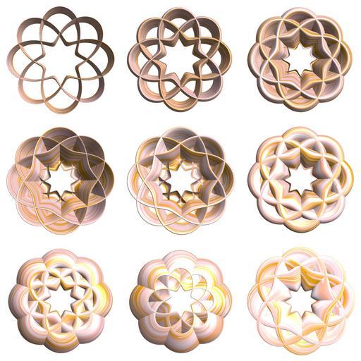 | Keywords: mathematica 3d cg parametricplot3d texture torus 輪環 りんかん ドーナツ どーなつ 八芒星 はちぼうせい 八光星 はちこうせい 八稜星 はちりょうせい program プログラム code コード algorithm コード アルゴリズム geometric sculpture geometricsculpture shape geometry sculpture mapping テクスチャ マッピング 模様 もよう abstract 抽象 ちゅうしょう アブストラクト design pattern デザイン パターン graphic グラフィック グラフィクス structure 意匠 構造 symmetry 対称性 たいしょうせい シンメトリー 対称 たいしょう algorithm indoor white background ceramic collection food round circle SetOptions[ParametricPlot3D, PlotRange -> Full, Mesh -> None, Boxed -> False, Axes -> None, PlotPoints -> 400, ImageSize -> 900, PlotStyle -> Directive[Specularity[White, 30], Texture[Import["D:/tmp/861.jpg"]]], TextureCoordinateFunction -> ({#4 + #5, #5/Pi} &), Lighting -> "Neutral"]; a = 3; (* center hole size of a torus *) b = 8; (* octa-torus *) v = 3; Manipulate[ x = (a - Cos[w t] - Sin[b s]) Cos[v s]; y = Sin[t]; z = (a - Cos[w t] - Sin[b s]) Sin[v s]; ParametricPlot3D[{x, y, z}, {t, 0, 2 Pi}, {s, 0, 2 Pi}] , {w, 0.1, 3, 0.05} ] (* --- The Texture is color changed version of this: www.flickr.com/photos/tanaka_juuyoh/5412528282 Lissajous figure / リサジュー図形(リサジューずけい) b/v が割り切れないと、このように複雑になる *) SetOptions[ParametricPlot3D, PlotRange -> Full, Mesh -> None, Boxed -> False, Axes -> None, PlotPoints -> 400, ImageSize -> 900, PlotStyle -> Directive[Specularity[White, 30], Texture[Import["D:/tmp/861.jpg"]]], TextureCoordinateFunction -> ({#4 + #5, #5/Pi} &), Lighting -> "Neutral"]; a = 3; (* center hole size of a torus *) b = 8; (* octa-torus *) v = 3; Manipulate[ x = (a - Cos[w t] - Sin[b s]) Cos[v s]; y = Sin[t]; z = (a - Cos[w t] - Sin[b s]) Sin[v s]; ParametricPlot3D[{x, y, z}, {t, 0, 2 Pi}, {s, 0, 2 Pi}] , {w, 0.1, 3, 0.05} ] (* --- The Texture is color changed version of this: www.flickr.com/photos/tanaka_juuyoh/5412528282 Lissajous figure / リサジュー図形(リサジューずけい) b/v が割り切れないと、このように複雑になる *) |