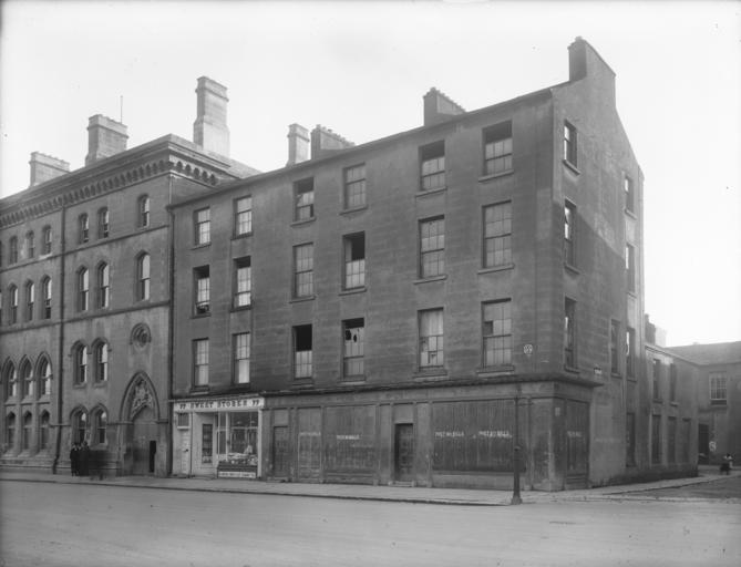 | Keywords: ulster bank ltd. ulsterbankltd ireland 1876 post office postoffice sweet stores sweetstores player's players navy cut cigarettes navycutcigarettes advertising shopkeeper bananas fruit goodman's studios goodmansstudios post no bills postnobills graffiti fp 22 ft. fp22ft exchange street exchangestreet october 1928 1920s custom house quay customhousequay vernacular poole collection poolecollection glass negative glassnegative a.h. poole ahpoole arthur henri poole arthurhenripoole women waterford national library of ireland nationallibraryofireland blackandwhite monochrome building architecture outdoor building complex black and white Ulster Bank premises on The Quays, Waterford before renovation. The building to the left, with 1876 carved over the doorway was the Custom House. Further to the left is Waterford G.P.O. (General Post Office). The Ulster Bank's still at this location. The little shop at no. 99, the Sweet Stores, has a lovely metal sign for Player's Navy Cut Cigarettes. A shopkeeper in white overalls can be seen peering out from under the bananas, with lots of fruit in the window - including tomatoes? Upstairs, signs on the windows read Goodman's Studios, and there's a woman leaning out of a second floor window. Shutters on no. 97 and 98, the proposed premises of Ulster Bank Ltd., have POST NO BILLS stencilled, but there's been time for plenty of chalked graffiti and doodles to be added by the local citizenry. A plaque on the front corner reads FP 22 Ft., i.e. a Fire Point was 22 feet away from that corner... Date: 23 October 1928 NLI Ref.: P_WP_3567 Ulster Bank premises on The Quays, Waterford before renovation. The building to the left, with 1876 carved over the doorway was the Custom House. Further to the left is Waterford G.P.O. (General Post Office). The Ulster Bank's still at this location. The little shop at no. 99, the Sweet Stores, has a lovely metal sign for Player's Navy Cut Cigarettes. A shopkeeper in white overalls can be seen peering out from under the bananas, with lots of fruit in the window - including tomatoes? Upstairs, signs on the windows read Goodman's Studios, and there's a woman leaning out of a second floor window. Shutters on no. 97 and 98, the proposed premises of Ulster Bank Ltd., have POST NO BILLS stencilled, but there's been time for plenty of chalked graffiti and doodles to be added by the local citizenry. A plaque on the front corner reads FP 22 Ft., i.e. a Fire Point was 22 feet away from that corner... Date: 23 October 1928 NLI Ref.: P_WP_3567 |