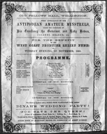 | Keywords: blackandwhite monochrome text writing black and white Arrangement of various decorative lettering, with decorative border. Tickets can be obtained from Messrs Lyon, H Blundell, Hughes, Laing, Russell, Farmery, E. G. Smith, and the Committee of the West Coast Frontier Relief Fund. Quantity: 1 b&w photo-mechanical print(s). Physical Description: Letterpress on silk, 250 x 203 mm. Evening Post (Wellington, N.Z.). Odd Fellows' Hall, Wellington :First appearance of the Antipodean Amateur Minstrels, under the patronage of His Excellency the Governor and Lady Bowen, Colonel Reader, etc. For the benefit of the West Coast Frontier Relief Fund, on Tuesday evening, 3rd November 1868. Programme ... 1868.. Ref: Eph-B-VARIETY-1868-01. Alexander Turnbull Library, Wellington, New Zealand. natlib.govt.nz/records/22867960 Arrangement of various decorative lettering, with decorative border. Tickets can be obtained from Messrs Lyon, H Blundell, Hughes, Laing, Russell, Farmery, E. G. Smith, and the Committee of the West Coast Frontier Relief Fund. Quantity: 1 b&w photo-mechanical print(s). Physical Description: Letterpress on silk, 250 x 203 mm. Evening Post (Wellington, N.Z.). Odd Fellows' Hall, Wellington :First appearance of the Antipodean Amateur Minstrels, under the patronage of His Excellency the Governor and Lady Bowen, Colonel Reader, etc. For the benefit of the West Coast Frontier Relief Fund, on Tuesday evening, 3rd November 1868. Programme ... 1868.. Ref: Eph-B-VARIETY-1868-01. Alexander Turnbull Library, Wellington, New Zealand. natlib.govt.nz/records/22867960 |