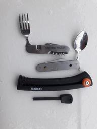 | Keywords: The Ozark Trails knife, fork and spoon, plus other things, is a set, and lock together when closed. It's a nice little gizmo for out and about, camping or roughing it in the back yard. The Gerber telescoping hand saw is thee best camping hand saw I have ever used. Period. Used properly, (people try to 'force-saw' with too much pressure, I've seen, with these small hand saw's, no matter the brand, and not let the teeth do the cutting,) these saws are excellent tools, very light and very compact and beat the pants off of any folding saw of this size I own. They used to be inexpensive before Gerber started marketing them under the Bear-Grills logo but they're still worth the money, I think. Actually, most Bear-Grills items are not too bad as outdoor gear goes. I used one of these saws extensively for a time and then bought two more, they're that good. They're 'more' useful in-camp than an axe. Honestly. The fire starter on the end makes great sparks for getting a fire going but I have to say, I do prefer lighters. If mountain men had the choice, they'd use lighters instead, too. The Ozark Trails knife, fork and spoon, plus other things, is a set, and lock together when closed. It's a nice little gizmo for out and about, camping or roughing it in the back yard. The Gerber telescoping hand saw is thee best camping hand saw I have ever used. Period. Used properly, (people try to 'force-saw' with too much pressure, I've seen, with these small hand saw's, no matter the brand, and not let the teeth do the cutting,) these saws are excellent tools, very light and very compact and beat the pants off of any folding saw of this size I own. They used to be inexpensive before Gerber started marketing them under the Bear-Grills logo but they're still worth the money, I think. Actually, most Bear-Grills items are not too bad as outdoor gear goes. I used one of these saws extensively for a time and then bought two more, they're that good. They're 'more' useful in-camp than an axe. Honestly. The fire starter on the end makes great sparks for getting a fire going but I have to say, I do prefer lighters. If mountain men had the choice, they'd use lighters instead, too. |