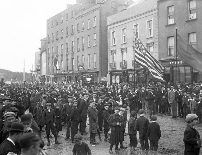 | Keywords: parade crowds shawlies pikes father matthew boys brigade fathermatthewboysbrigade 1798 commemoration 1798commemoration byrne flags harp stars & stripes starsstripes old glory oldglory children quays ireland munster barefoot kirwan laffan a.h. poole ahpoole arthur henri poole arthurhenripoole poole collection poolecollection glass negative glassnegative date established dateestablished american bar americanbar waterford national library of ireland nationallibraryofireland london & north western railway londonnorthwesternrailway blackandwhite monochrome people crowd architecture building outdoor black and white We have seen aspects of this parade before, but ofarrl asked to see another shot of it, because "the Stars & Stripes are again on display but there is an Irish Harp flag displayed on the right which would not have been the flag of choice for unionists and it's interesting that there are no Union Jacks displayed in either photo." Think this is very much not the usual Boys' Brigade, but rather Father Matthew Boys' Brigade - given the pikes, etc. Thanks to ofarrl for helping to establish an exact date for this event. See the comments below... Also good to see London & North Western Railway Co. in the background, as we've been there before too... Date: Sunday, 28 May 1898 NLI Ref: POOLEWP 0956 You can also view this image, and many thousands of others, on the NLI’s catalogue at catalogue.nli.ie We have seen aspects of this parade before, but ofarrl asked to see another shot of it, because "the Stars & Stripes are again on display but there is an Irish Harp flag displayed on the right which would not have been the flag of choice for unionists and it's interesting that there are no Union Jacks displayed in either photo." Think this is very much not the usual Boys' Brigade, but rather Father Matthew Boys' Brigade - given the pikes, etc. Thanks to ofarrl for helping to establish an exact date for this event. See the comments below... Also good to see London & North Western Railway Co. in the background, as we've been there before too... Date: Sunday, 28 May 1898 NLI Ref: POOLEWP 0956 You can also view this image, and many thousands of others, on the NLI’s catalogue at catalogue.nli.ie |