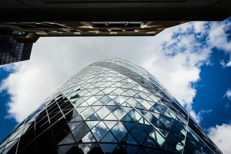 Keywords: office buildings glass reflection sky london the gherkin business building modern urban structure tall skyscraper clouds