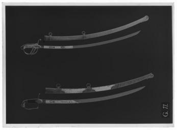 Keywords: Officerssabel, Frankrike ca 1815-1818, tillåten modell, Sverige - Livrustkammaren - 777-negative.tif Fäste av förgylld reliefornerad mässing kavelns sidostycken av pärlemor <br/><br/>Kappa framtill i form av ett lejonhuvud med manen inramad av en slät list och baktill övergående i ett insvängt och nedåtböjt mellanled på vars översida ett palmettliknande ornament Nederdelen formad som en nedåtriktad fjällmönstrad holk Handbygel platt överdelen intappad i lejonets gap nederdelen insvängd och med ett spiralornament rätvinkligt övergående i den raka främre parerstången; handbygelns utsida ornerad med en längsgående bladranka något ovanför mitten en infälld trofégrupp Bakre parerstång rak med nedåtböjd ytterände formad som en palmett Styrskenor med tvärt avskuren överdel och vidgad rundad nederdel den förra ornerad med ett palmettliknande ornament den senare med en mansmaskaron omgiven av bladornament <br/>Kavel med rektangulärt tvärsnitt avsmalnande uppåt de smala fram- och baksidorna belagda med en 15mm bred bård av förgylld mässing ornerad med en längsgående tuktad lagerranka; ut- och insidorna belagda med släta pärlemorskivor med en bredd nedtill av 35 mm <br/><br/>Klinga böjd eneggad utom vid det tvåeggade spetspartiet; ryggen plan Fram till spetsen en bred grund hålkäl Starka delen med etsad och förgylld ornering mot blånerad botten som upptill är snett avskuren mot eggsidan; ryggpartiet förgyllt den blånerade bottnen med en smal förgylld kantbård Baspartiet med ett förgyllt rektangulärt fält vari tecknat med tunna linjer trekronorsvapnet i oval sköld mot tvärstreckad botten över skölden en girland Ovanför baspartiet under svensk hertigkrona ett graverat monogram i skrivstil C J det hela förgyllt Upptill en femuddig förgylld stjärna omgiven av strålar original caption - 1815 1818 brass b1 - blankvapen - fäste material mässing - mother-of-pearl b6 - blankvapen - kavel och kavelklädsel material pärlemor - steel b2 - blankvapen - klinga material stål size mm 1024 size mm 132 size mm 880 klinga size mm 32 klinga g 800 LRK C J hertigkrona anv b5 - blankvapen - klingdekor; Karl XIV Johan av Sverige-Norge C J hertigkrona anv b5 - blankvapen - klingdekor; Karl XIV Johan av Sverige-Norge place of origin original filename LN_B04890_007770 49849 inventory number LRK 13321 777 CC0 Officerssabel Frankrike ca 1815-1818 tillåten modell Sverige - Livrustkammaren - 777 tif |