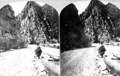 Keywords: stereoscopic stereophotography stereophotographs historical usgs history geology mapping black and white blackandwhite bnw stereograph blackandwhite monochrome outdoor black and white Ogden Canyon 3 miles above its mouth. A narrow gorge cut through the rocks, with walls 1,500 to 2,000 feet in height, the roadway being built up from the bed of the creek. In the center of the view, a cone-like mass of quartzites, most distinctly and beautifully stratified, stands up at an angle of 55 degrees and 100 feet high. A very interesting geological picture. Weber County, Utah. 1871. (Stereoscopic view similar to 1281) Ogden Canyon 3 miles above its mouth. A narrow gorge cut through the rocks, with walls 1,500 to 2,000 feet in height, the roadway being built up from the bed of the creek. In the center of the view, a cone-like mass of quartzites, most distinctly and beautifully stratified, stands up at an angle of 55 degrees and 100 feet high. A very interesting geological picture. Weber County, Utah. 1871. (Stereoscopic view similar to 1281) |