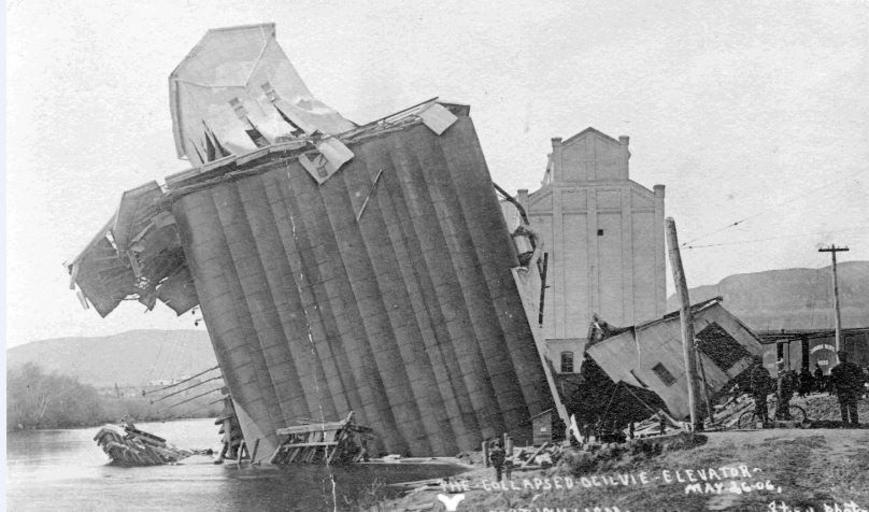 | Keywords: ogilvie collapse grain elevator grainelevator ontario canada history ogilvie flour mill ogilvieflourmill disaster thunder bay thunderbay fort william fortwilliam monochrome outdoor blackandwhite black and white Date: May 26, 1906 Description: When it was built in 1904, the Ogilvie Flour Mill's grain elevator was touted as having the smallest foundation but the loftiest storage house in the port. Unfortunately, it was this small foundation that would prove defective. Just before 9:00 pm on May 26th, 1906, a lone millwright working in the basement of the brand new grain elevator heard the sudden snapping of beams throughout the structure and ran away as fast as he could. Within minutes, all 26 bins of the 90-foot-high steel elevator containing 380,000 bushels of wheat slipped from their foundation and plunged into the Kaministiquia River, wrecking the receiving house, the wharf, and one of the most modern grain handling plants on the continent. The elevator continued to shift over the next day until finally it stood, poised precariously at a 15 degree angle, about 50 feet from its original location. This photograph shows a crew of men dismantling the top of the elevator after its collapse. Remarkably, the same engineering firm that built the defective structure in the first place was hired to build a new one, twice as large as the first. The firm managed to accomplish this feat in time for the fall harvest. Ogilvie's mill, still producing starch and gluten, was shut down in 1944, but operated again from 1997-2000 as Riverside Grain Products. A spectacular blaze totally consumed the mill in October 2001, leaving only the empty bins that are still visible today. Accession No.: 973.13.314 C Date: May 26, 1906 Description: When it was built in 1904, the Ogilvie Flour Mill's grain elevator was touted as having the smallest foundation but the loftiest storage house in the port. Unfortunately, it was this small foundation that would prove defective. Just before 9:00 pm on May 26th, 1906, a lone millwright working in the basement of the brand new grain elevator heard the sudden snapping of beams throughout the structure and ran away as fast as he could. Within minutes, all 26 bins of the 90-foot-high steel elevator containing 380,000 bushels of wheat slipped from their foundation and plunged into the Kaministiquia River, wrecking the receiving house, the wharf, and one of the most modern grain handling plants on the continent. The elevator continued to shift over the next day until finally it stood, poised precariously at a 15 degree angle, about 50 feet from its original location. This photograph shows a crew of men dismantling the top of the elevator after its collapse. Remarkably, the same engineering firm that built the defective structure in the first place was hired to build a new one, twice as large as the first. The firm managed to accomplish this feat in time for the fall harvest. Ogilvie's mill, still producing starch and gluten, was shut down in 1944, but operated again from 1997-2000 as Riverside Grain Products. A spectacular blaze totally consumed the mill in October 2001, leaving only the empty bins that are still visible today. Accession No.: 973.13.314 C |