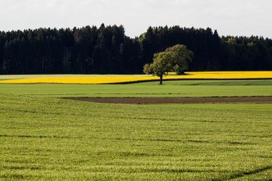 Keywords: oilseed rape agricultural operation yellow field harvest field of rapeseeds arable cereal fields cultivation landscape forest edge of the woods spring trees tree