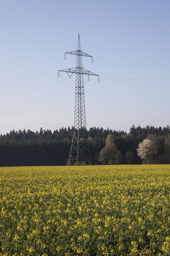 Keywords: oilseed rape agricultural operation yellow field harvest field of rapeseeds arable cultivation flower landscape power poles forest spring