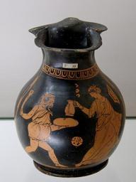 Keywords: Oinochoe phlyax BM F99.jpg Choes Group Herakles chasing a woman scene of a phlyax play Apulian red-figured oinochoe ca 370 “360 BC From the Basilicata Héraclès pourchassant une femme scène d'une pièce phlyaque Å’nochoé apulienne à figures rouges vers 370-360 av J -C Provenance Basilicate Museum British Museum Upper floor room 73 The Greeks in Southern Italy object history credit line Former Blacas Collection accession number GR 1867 5-8 1287 Cat Vases F 99 Jastrow 2006 other versions Heracles in ancient Greek pottery Apulian red-figure pottery Ancient Greek pottery in the British Museum Ancient Greek pottery oinochoes British Museum Phlyax scenes Choes Group Room 73 British Museum Blacas Collection 370s BC pottery United Kingdom 360s BC pottery united Kingdom Apulian pottery in the United Kingdom |