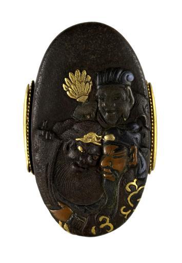 Keywords: Okamoto Naoshige - Kashira with the Chinese Generals Kanyu, Gentoku and Chohi - Walters 511033 - Top.jpg The three figures on the kashira are the Chinese generals Kanyu Ch Guan Yu Kuan Yu Gentoku Ch Liu Bei Liu Pei and Chohi Ch Zhang Fei Chang Fei They fought together in the 2nd century at the beginning of the Three Kingdoms period Gentoku eventually became emperor of Shu Shu Their story is at the center of the 14th-century Chinese novel Romance of the Three Kingdoms This is part of a set with Walters 51 1032 middle Other date century 18 Edo iron copper gold and silver cm 3 3 accession number 51 1033 20508 Henry Walters Baltimore date and mode of acquisition unknown Walters Art Museum Henry Walters Acquired by Henry Walters none place of origin Kyoto Japan Walters Art Museum license Tosogu Japanese sword fittings in the Walters Art Museum Okamoto Naoshige Media contributed by the Walters Art Museum needs category review Liu Bei Guan Yu Zhang Fei |