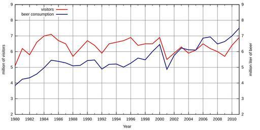 | Keywords: Oktoberfest stats.svg de Entwicklung der Besucherzahlen und des Bierkonsums des Oktoberfests seit 1980 2010-09-18 Created with Gnuplot Own work <br /> Data from http //www muenchen de Gorgo thumb de-version Gnuplot script to generate this plot <source lang gnuplot > /usr/bin/gnuplot gnuplot 4 2 / Ubuntu 8 10 input set timefmt Y set datafile separator ; output set key top left set style data lines set grid set xdata time set xlabel 'Year' set xrange '1980' '2011' set xtics 63072000 set mxtics 2 set format x ' Y' set ylabel 'million of visitors' set ytics nomirror set yrange 2 9 set ytics 1 set y2tics 1 set autoscale y2 set y2label 'million liter of beer' set term svg size 800 400 font Arial 10 set output 'oktoberfest_stats svg' plot '-' using 1 2 title 'visitors' axes x1y1 lt rgb 'red' lw 2 \ '-' using 1 2/10000 title 'beer consumption' axes x1y1 lt rgb 'dark-blue' lw 2 1980;5 1 1981;6 2 1982;5 8 1983;6 6 1984;7 1985;7 1 1986;6 7 1987;6 5 1988;5 7 1989;6 2 1990;6 7 1991;6 4 1992;5 9 1993;6 5 1994;6 6 1995;6 7 1996;6 9 1997;6 4 1998;6 5 1999;6 5 2000;6 9 2001;5 5 2002;5 9 2003;6 3 2004;5 9 2005;6 1 2006;6 5 2007;6 2 2008;6 2009;5 7 2010;6 4 2011;6 9 e 1980;38438 1981;42434 1982;43323 1983;45760 1984;49713 1985;54541 1986;53807 1987;52817 1988;50951 1989;51241 1990;54300 1991;54686 1992;48888 1993;51933 1994;52108 1995;50162 1996;52622 1997;55891 1998;54782 1999;60054 2000;64591 2001;48698 2002;57614 2003;62294 2004;61163 2005;61012 2006;68617 2007;69406 2008;64922 2009;66436 2010;70000 2011;75000 e </source> Oktoberfest Statistics of Munich Images with Gnuplot source code |