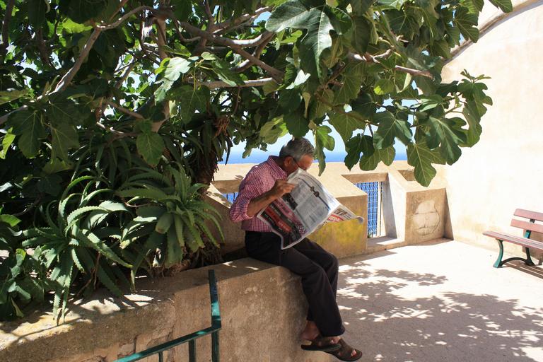 Keywords: old man tree shadow read newspaper morning relax lesure time