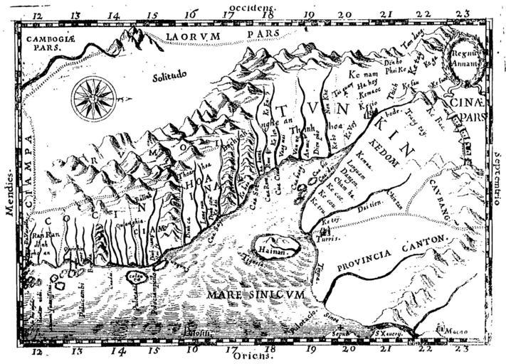 Keywords: Old map of Vietnam.jpg Early Western Map of Tonkin 1651 One of the earliest Western maps showing details of northern and central Vietnam appeared in Father Alexander de Rhodes's Histoire dv royavme de Tvnqvin published in Rome in 1650 This map is from the French edition published a year later in Lyon Oriented with the north to the right Regnu Annam shows the extent of seventeenth-century Vietnam then divided between two rival dynasties one in the north and the other in central Vietnam Remnants of the Cham kingdom eventually destroyed by the Vietnamese still exist in the south To the west are the highlands occupied by Rumoi upland minority groups later called montagnards by the French The limited Western knowledge of the interior is illustrated by the large region labeled Solitudo originally from http //www loc gov/rr/asian/guide/guide-southern html High-resolution version from http //gallica bnf fr/ark /12148/bpt6k54392965 image r 19 f19 pagination The BNF PD-old Old maps of Vietnam Maps of Champa Kingdom of Annam Alexandre de Rhodes |